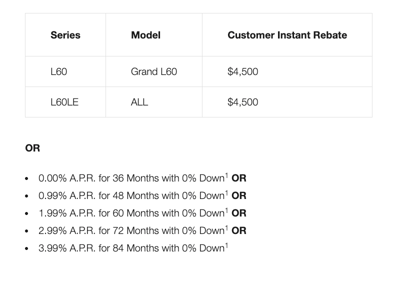 - $250 Instant Rebate for Cash or Standard Rate Financing²