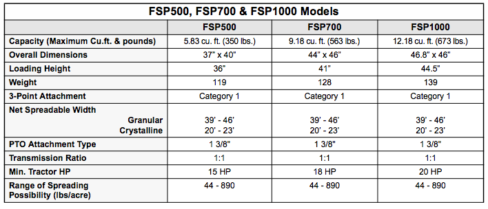 FSP Series rotary/spin type Broadcast Spreaders are capable of spreading seed, sand, salt, top dressings, lime, prilled/granular fertilizer, and most all other types of granular materials at delivery rates ranging from 43-890 lbs. per acre. Agitator extension comes standard. The spread rate, capability, and range of hopper capacities make FSP Spreaders well suited for applications on farms, golf courses, food plots, park systems, athletic fields, campuses, and smaller municipal or commercial operations. They excel at spreading sand or salt for control of ice and snow.